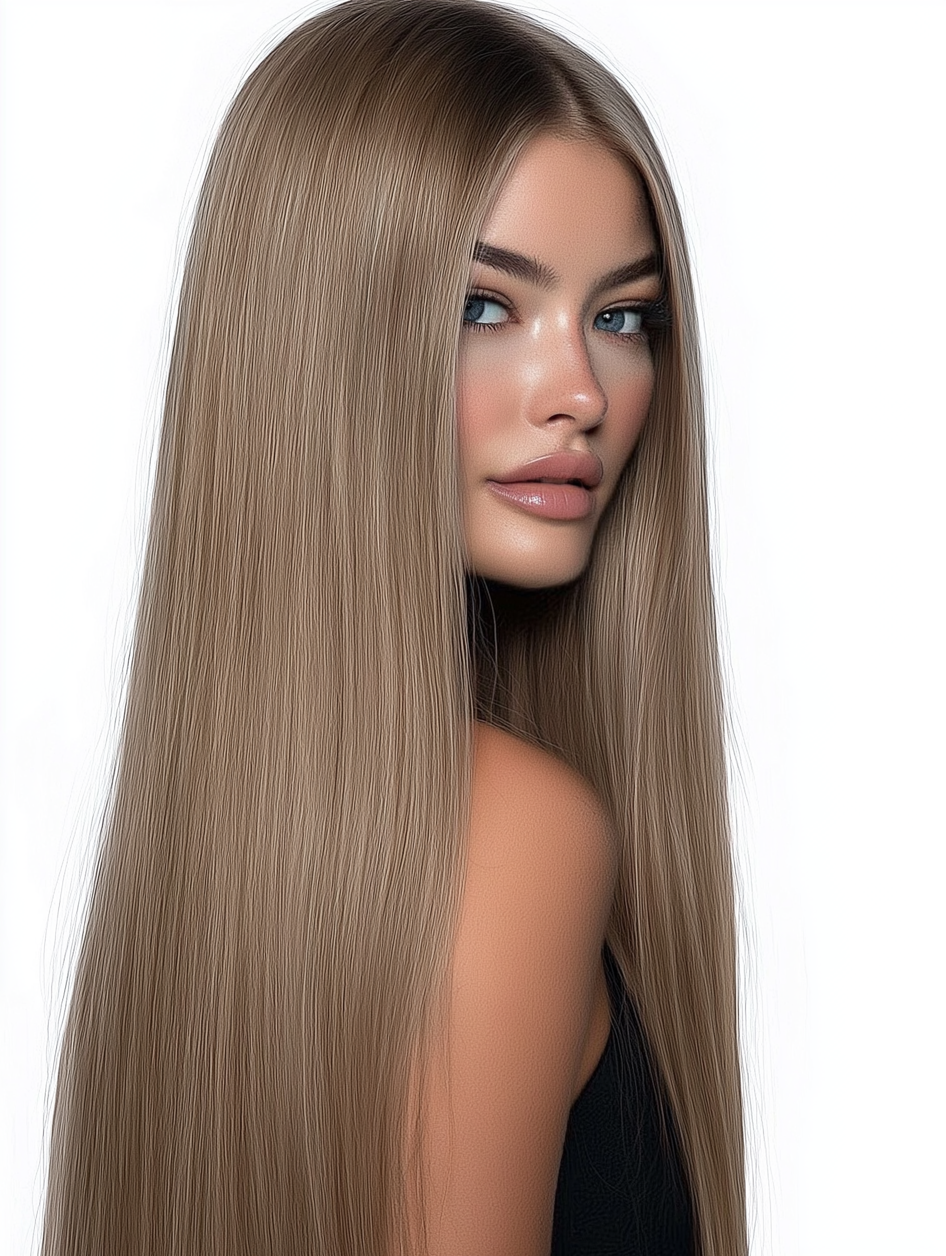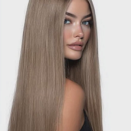 Almond Nude is een neutraal-koele blonde tint met een zachte, romige finish. Denk amandel blond met een mix van beige blond, zand blond en taupe-blond, afgewerkt met parel/linnen highlights en een subtiele donkerblonde shadow root. Fris en modern—zonder gele of koperige zweem (mushroom-blonde vibes).