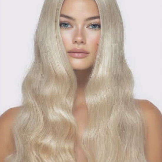 Golden Affair is een lichte goudblonde tint met honing- en vanilletonen en een hoeveelheid champagneglans . Fijne zand/beige lowlights en een zachte beige shadow root zorgen voor natuurlijke diepte. Warm-neutraal en sprankelend—zonder oranje of gele zweem.