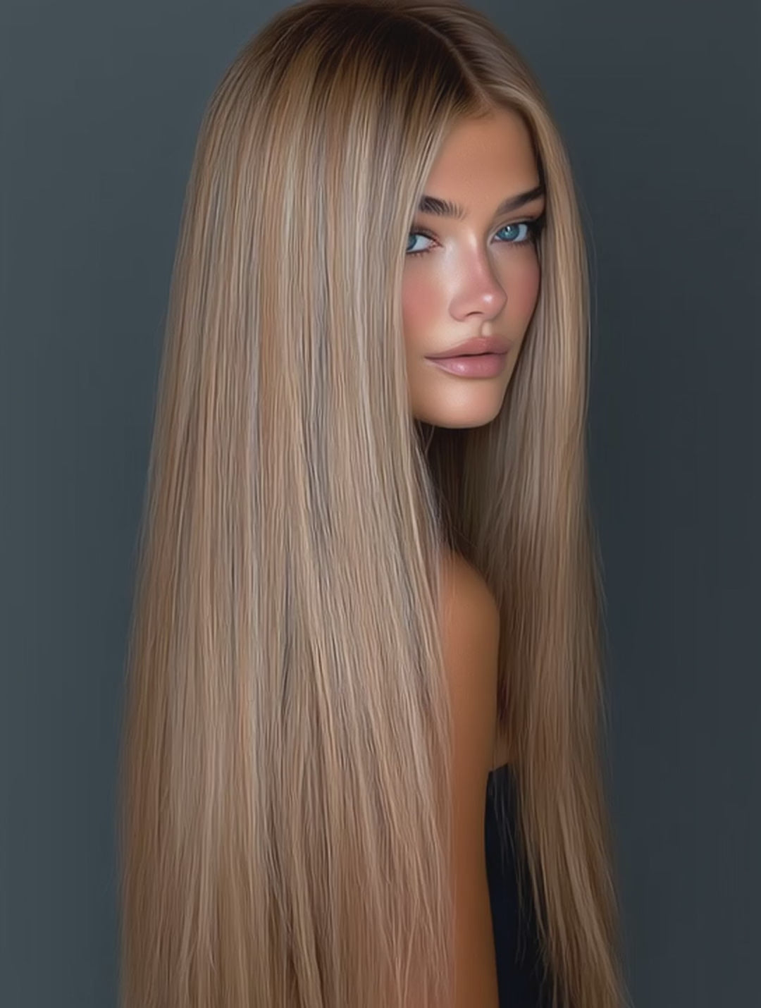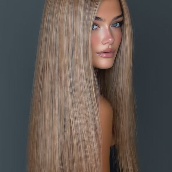 Caramel Kiss is een warme beige-/karamelblonde tint met honing- en vanille-highlights en zachte champagneglans . De diepte komt van ongeveer zand blonde lowlights en een natuurlijke donkerblonde schaduwaanzet voor een tijdelijke blend.