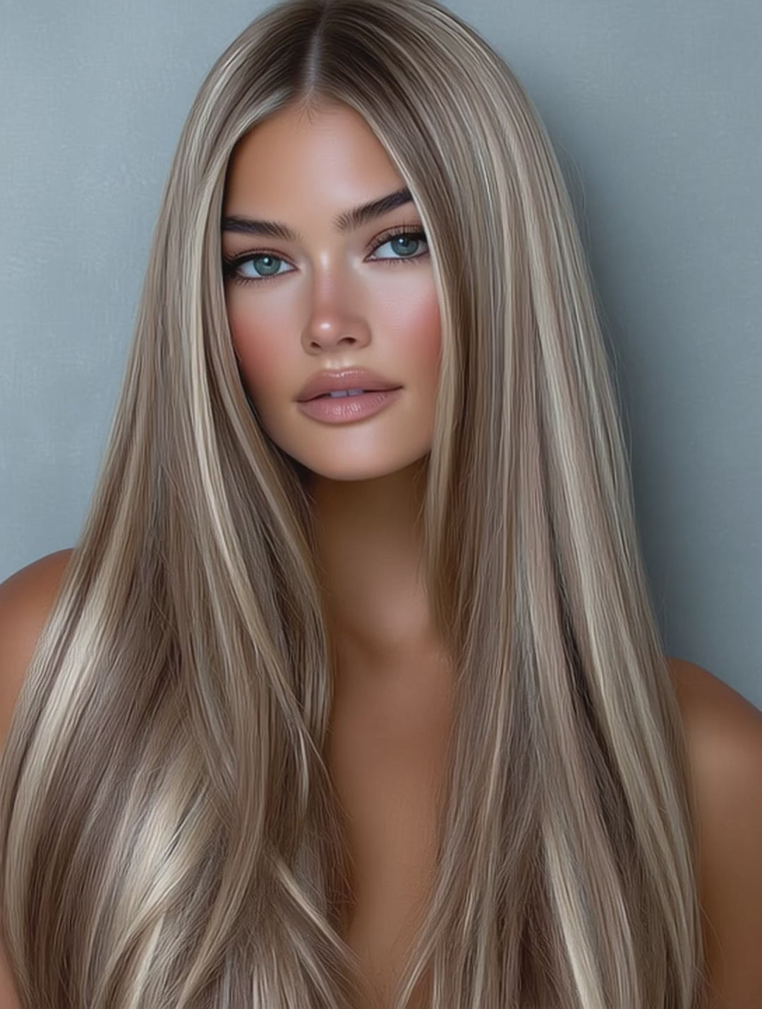- Kleuromschrijving: basis sand/wheat blond met pearl & champagne highlights, mushroom/taupe lowlights en as-donkerblonde shadow root