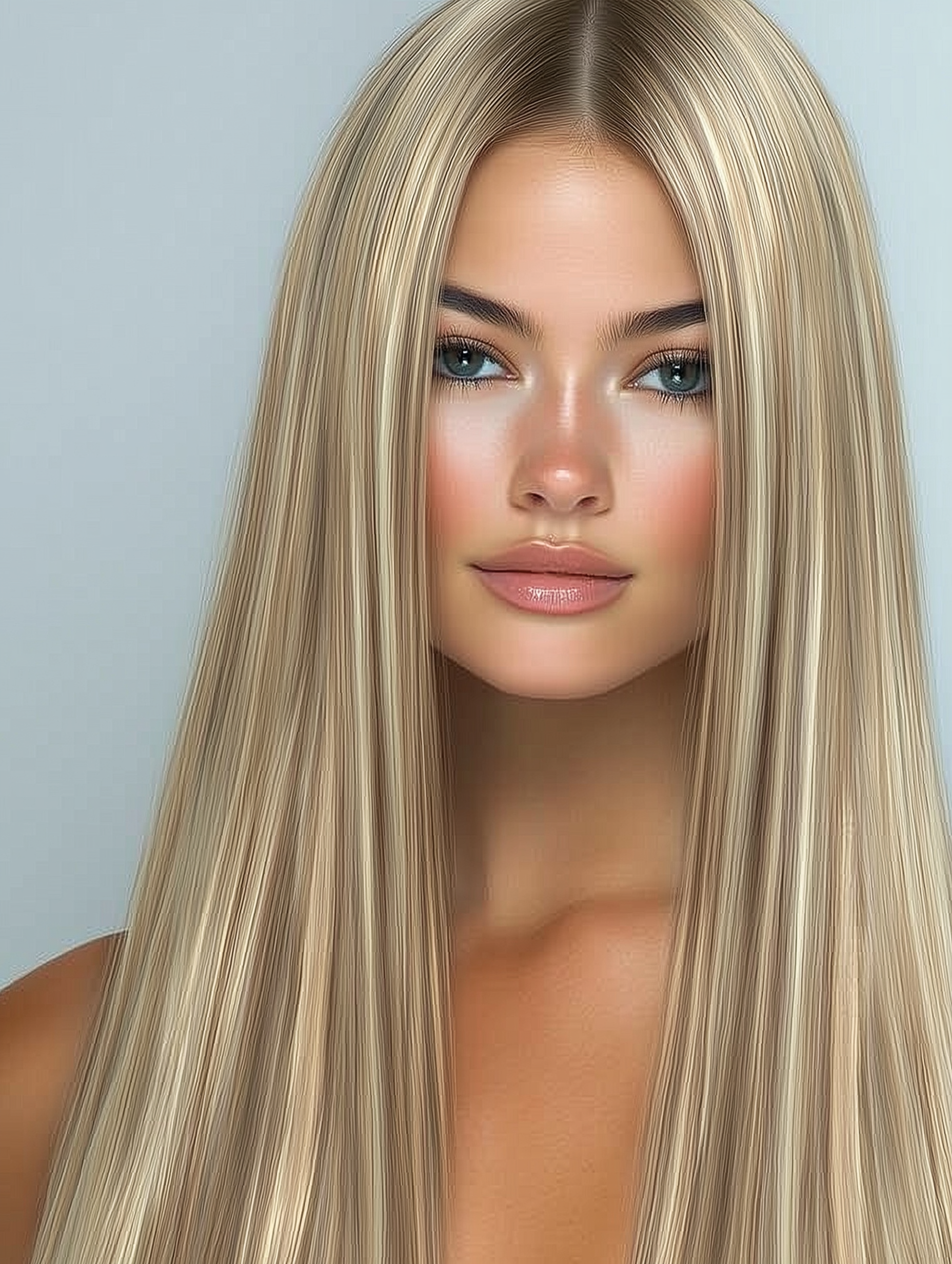 - Kleuromschrijving: beige/zand blond met pearl-ash highlights, champagne-accenten, mushroom/taupe lowlights en donkerblonde shadow root