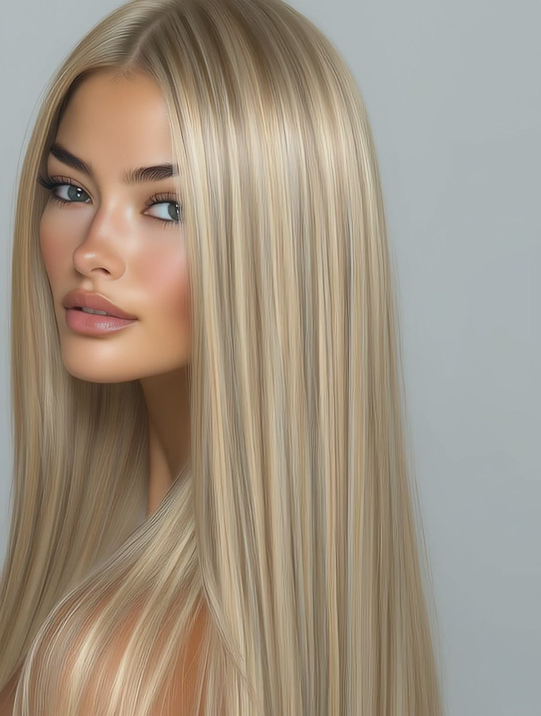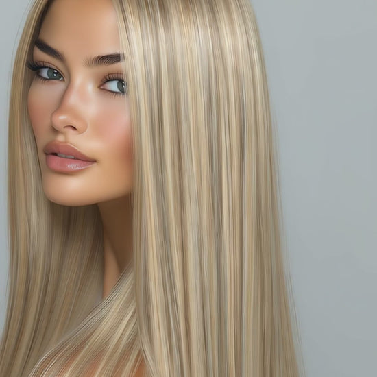 Smokey Blonde is een beige/zand blonde mix met een rook achtige ash zweem. De kleur combineert sand/wheat (tarwe) blond met pearl-ash highlights en verfijnde champagne-accenten. Mushroom/taupe lowlights en een zachte donkerblonde shadow root zorgen voor natuurlijke diepte. Ondertoon: neutraal-koel – fris en modern, zonder gele of koperige zweem.