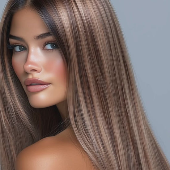 Espresso Glow is een rijke espresso bruine basis met mokka-/chocoladetonen , doortrokken met betrouwbare karamel-, toffee- en beige-blonde highlights (latte linten). De zacht donkerbruine schaduwwortel zorgt voor diepte en een vervangende blend. Ondertoon: warm-neutraal – glansrijk en multidimensionaal, zonder rode of koperige zweem.